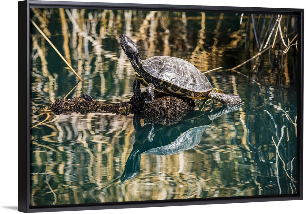 <p>Pond Slider turtle (Trachemys scripta) sunning on a submerged log and showing its reflection in a pond at the Riparian Preserve at Water Ranch; Gilbert, Arizona, United States of America</p>