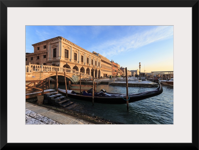 <p>Gondola, Ponte Della Paglia and Riva Degli Schiavoni at sunrise after snow, Venice, Veneto, Italy</p>
