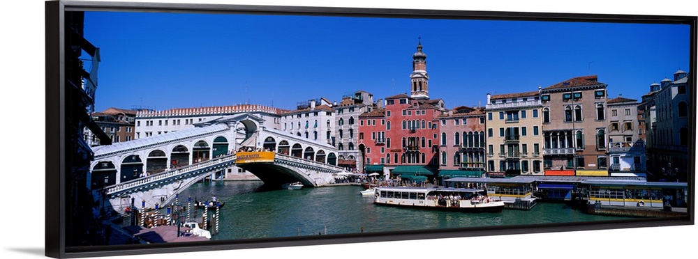 <p>This panoramic view shows the Rialto bridge over the grand canal in Venice with buildings lining the water behind the bridge.</p>