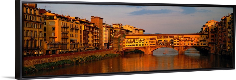 <p>Wide angle photograph of buildings alongside the Arno River, with a view of he Ponte Vecchio bridge, at sunset in Florence, Italy.</p>