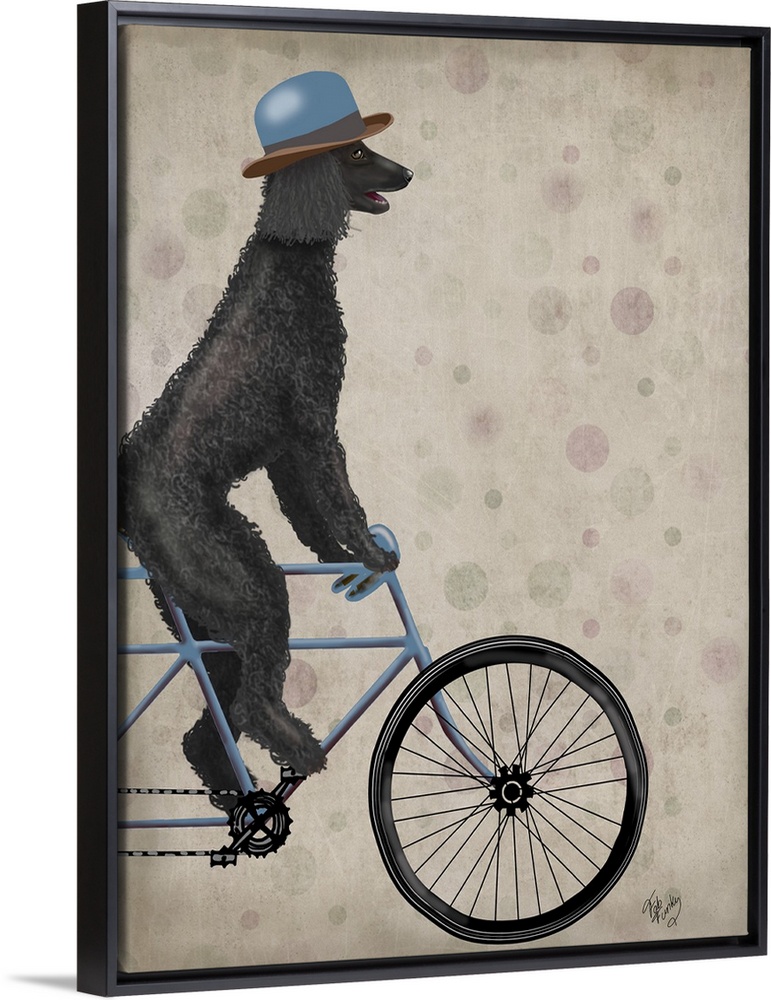<p>Decorative artwork of black Poodle riding on a blue bicycle and wearing a matching blue hat.</p>