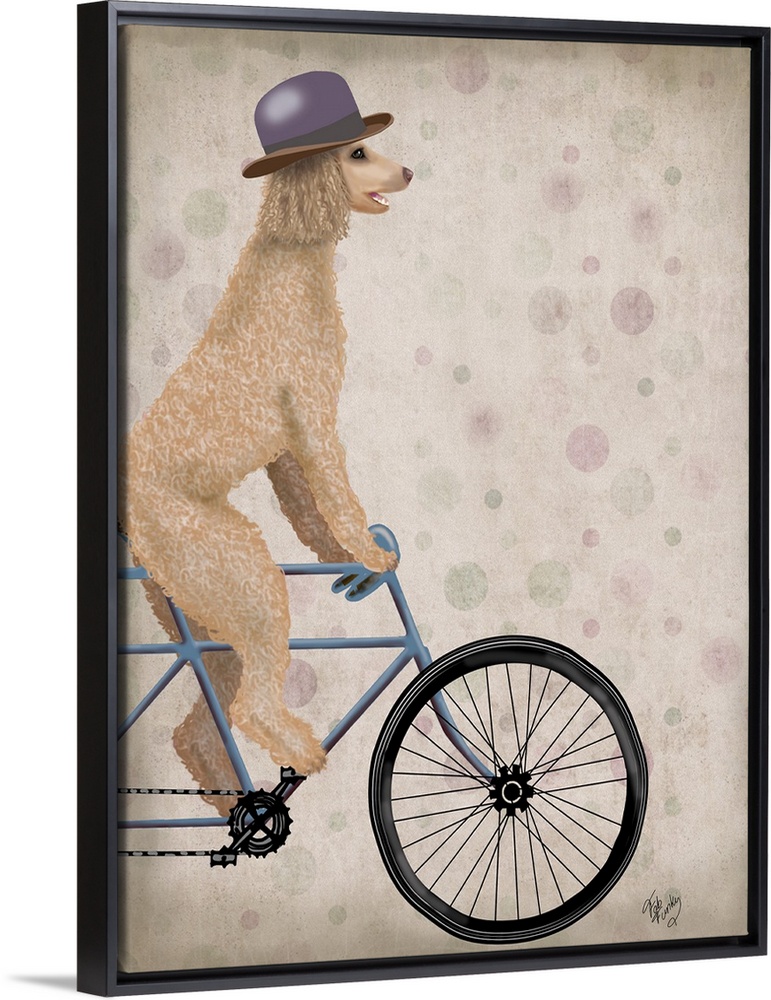 <p>Decorative artwork of cream Poodle riding on a blue bicycle and wearing a purple hat.</p>