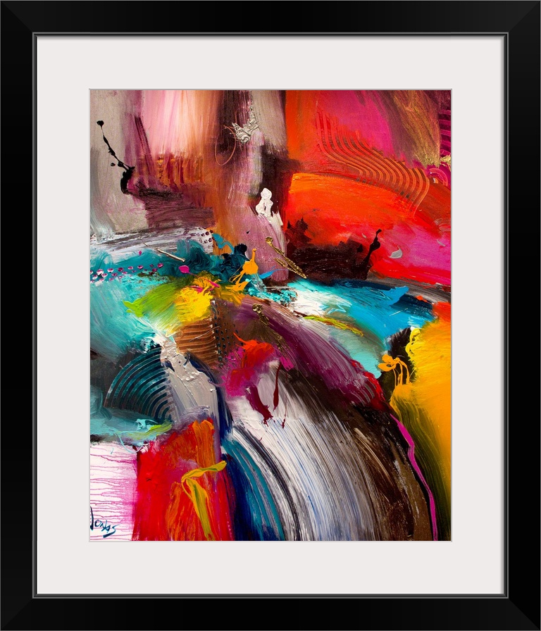 <p>Huge abstract art incorporates oddly sized patches of vibrant colors with harsh brush strokes. Artist includes a couple variety of patterns composed of straight and wavy lines.</p>