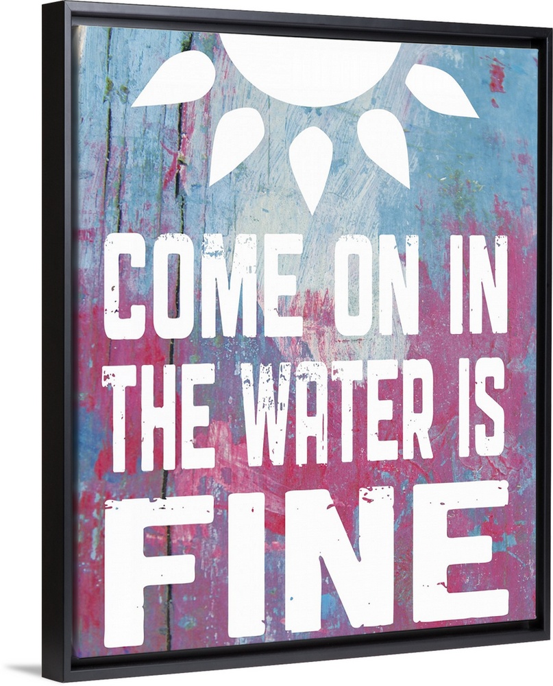 <p>The words "Come on in, the water is fine" and a sun shape on a pink and blue textured background.</p>