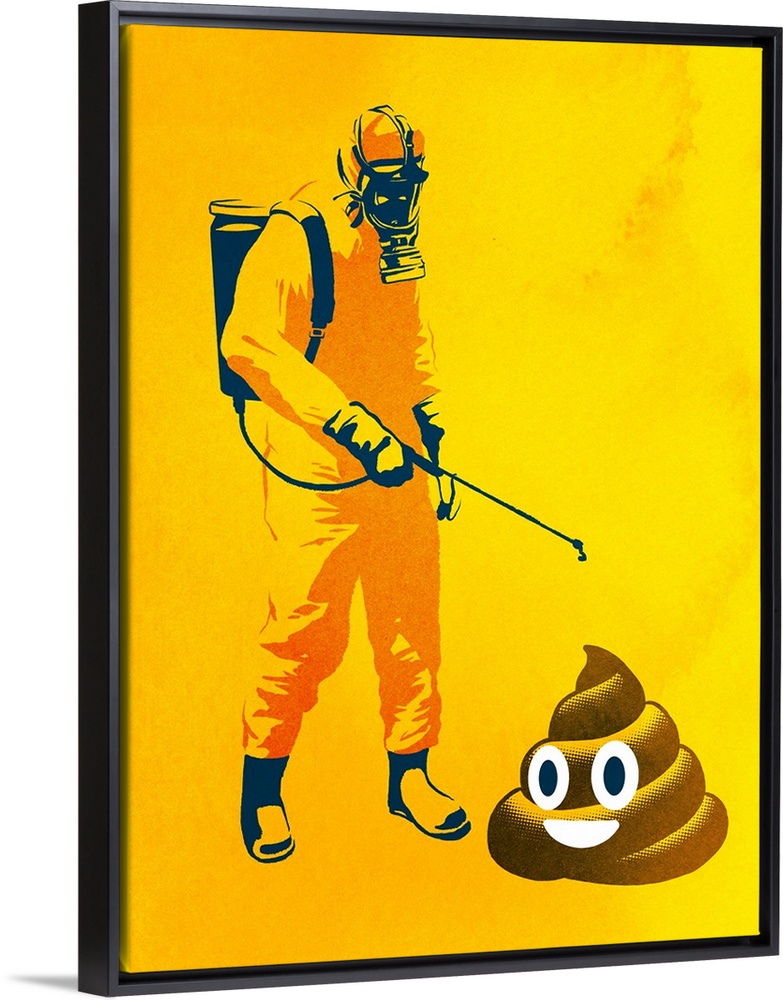 <p>A person in a hazmat suit spraying a large poop emoji.</p>