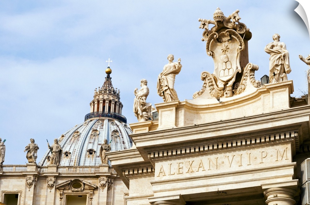 <p>Pope's insignia between two statues of saints on the Bernini's 17th century colonnade, Piazza San Pietro, St. Peter's square, Vatican City, Unesco World Heritage Site, Rome, Lazio, Italy.</p>