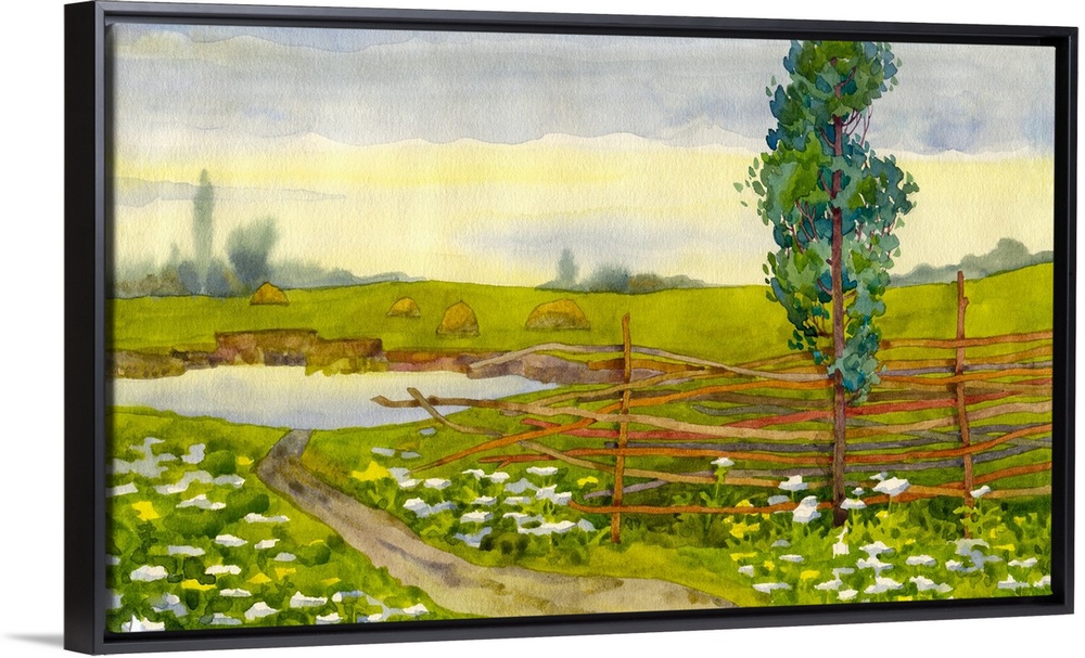 <p>Watercolor landscape of a poplar near a fence,</p>