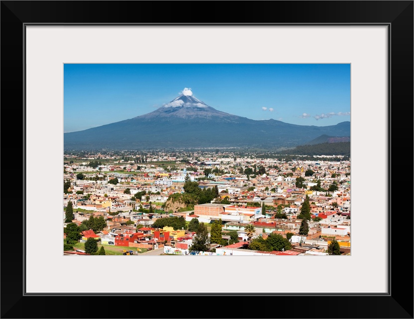 <p>Aerial photograph of the Popocatepetl Volcano in Puebla, Mexico, with a bird's eye view of the city in the foreground. From the Viva Mexico Collection.</p>