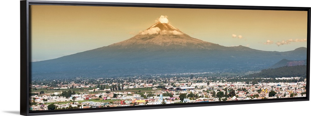 <p>Panoramic aerial photograph of the Popocatepetl Volcano in Puebla, Mexico, with a bird's eye view of the city underneath. From the Viva Mexico Panoramic Collection.</p>