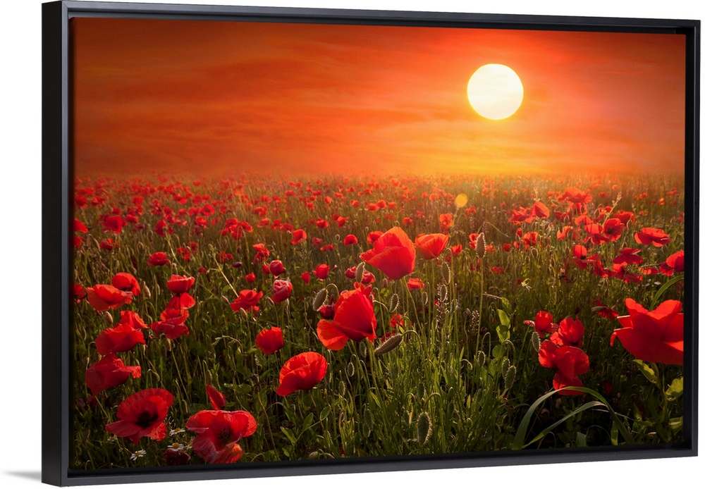 <p>Fine art photograph of a field of red poppies under the setting sun.</p>