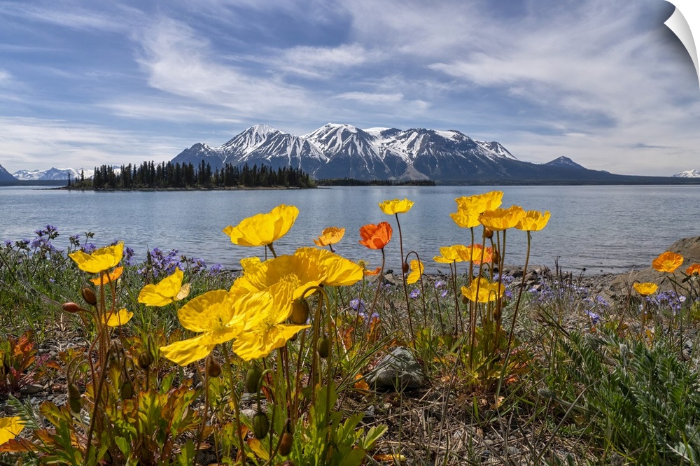 <p>Poppies create a beautiful splash of colour to an already beautiful scene in Atlin, British Columbia; Atlin, British Columbia, Canada.</p>