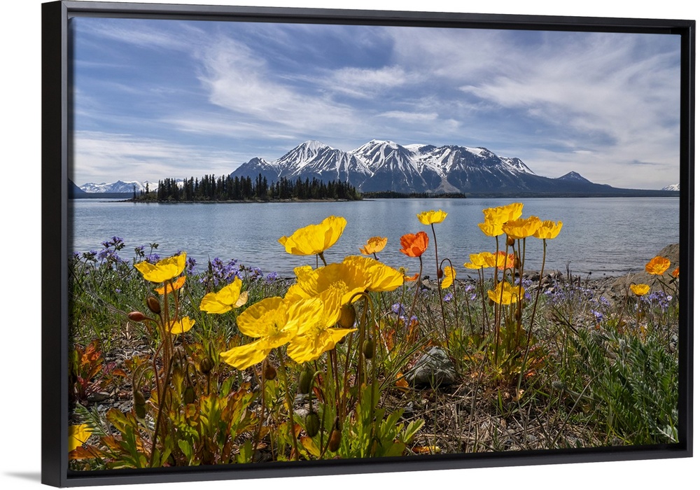 <p>Poppies create a beautiful splash of colour to an already beautiful scene in Atlin, British Columbia; Atlin, British Columbia, Canada.</p>