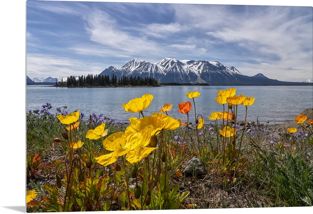 <p>Poppies create a beautiful splash of colour to an already beautiful scene in Atlin, British Columbia; Atlin, British Columbia, Canada.</p>