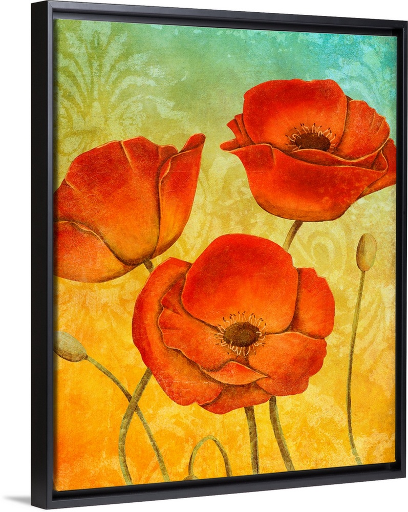 <p>Contemporary painting of three red poppies on a yellow and blue background.</p>