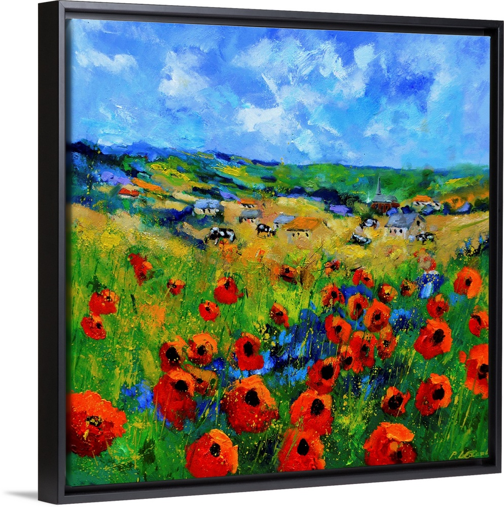 <p>Contemporary abstract painting of a bright field of poppies.</p>
