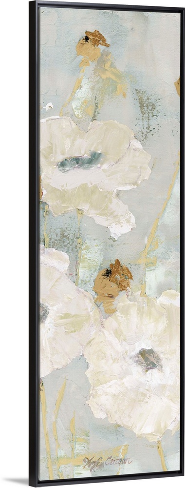 <p>Contemporary painting of a group of white poppies on a muted gray backdrop.</p>