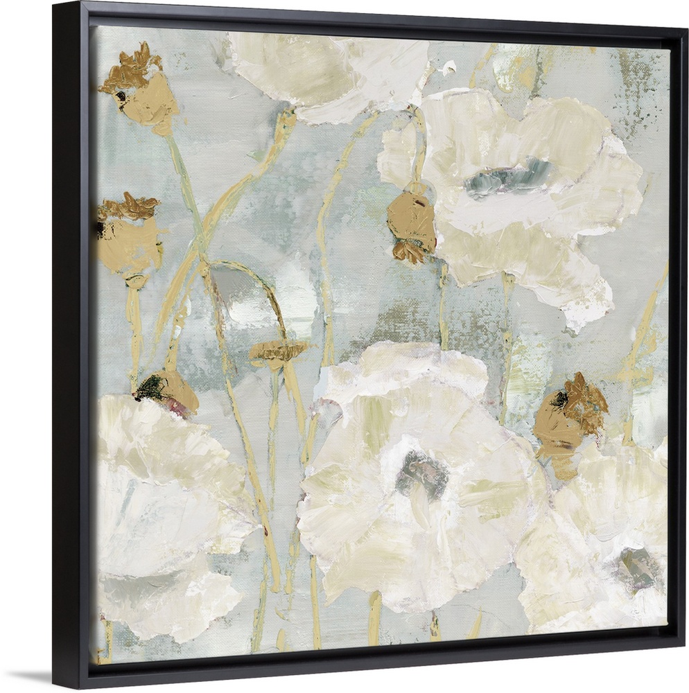 <p>Contemporary painting of a group of white poppies on a muted gray backdrop.</p>