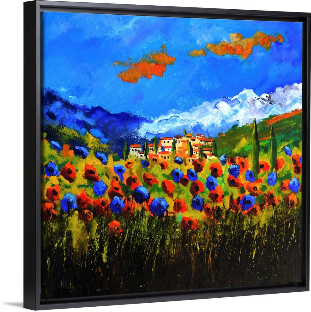 <p>Vibrant painting of a bright Summer day with blossoming poppies, a colorful sky, and the village of Tuscany in the distance.</p>