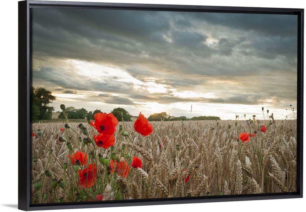<p>Red poppies in wheat/barley field under moody dramatic sunset with dark clouds.</p>