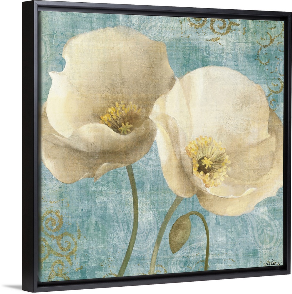 <p>This is a square shaped decorative accent for the hope of living room showing tow light colored flower blossoms contrasting with a textured background that contains scroll work embellishments and paisley patterns.</p>