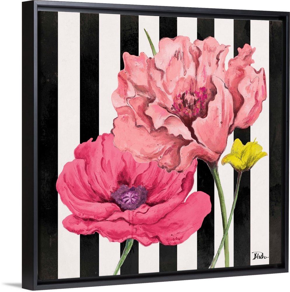 <p>A square painting of pink poppy flowers on a black and white vertically striped background.</p>