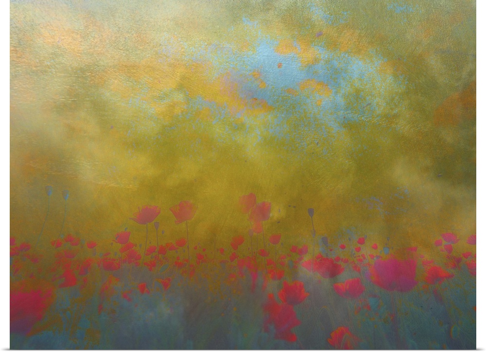 <p>Abstract image of red poppy flowers in a field under a stormy sky.</p>