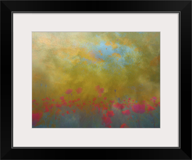 <p>Abstract image of red poppy flowers in a field under a stormy sky.</p>
