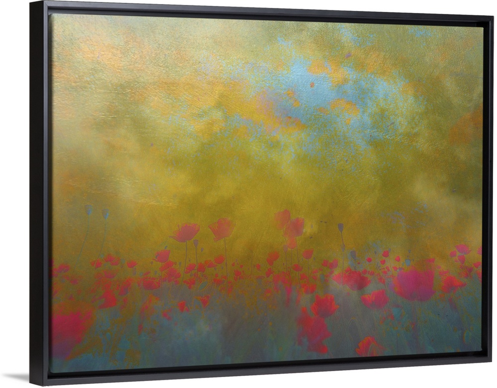 <p>Abstract image of red poppy flowers in a field under a stormy sky.</p>