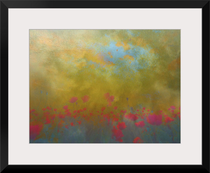 <p>Abstract image of red poppy flowers in a field under a stormy sky.</p>