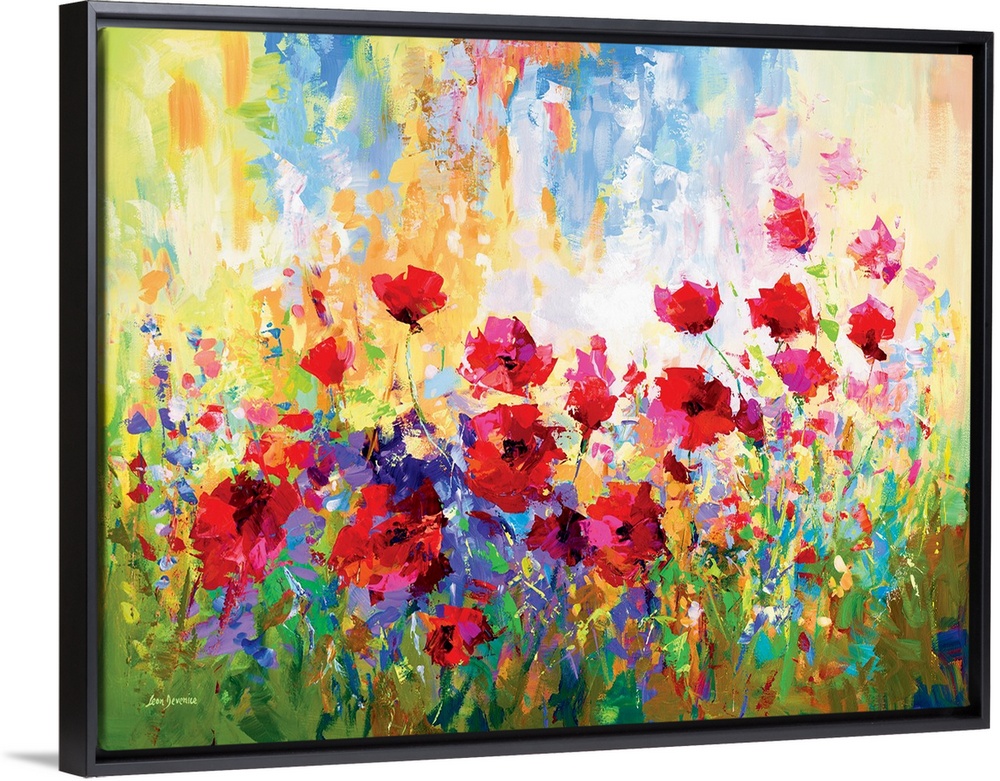<p>Contemporary painting of a vibrant poppy field. The red petals contrast beautifully against the colorful abstract blooms. The brush strokes are loose and impressionistic, creating abstract patterns across the painting.</p>