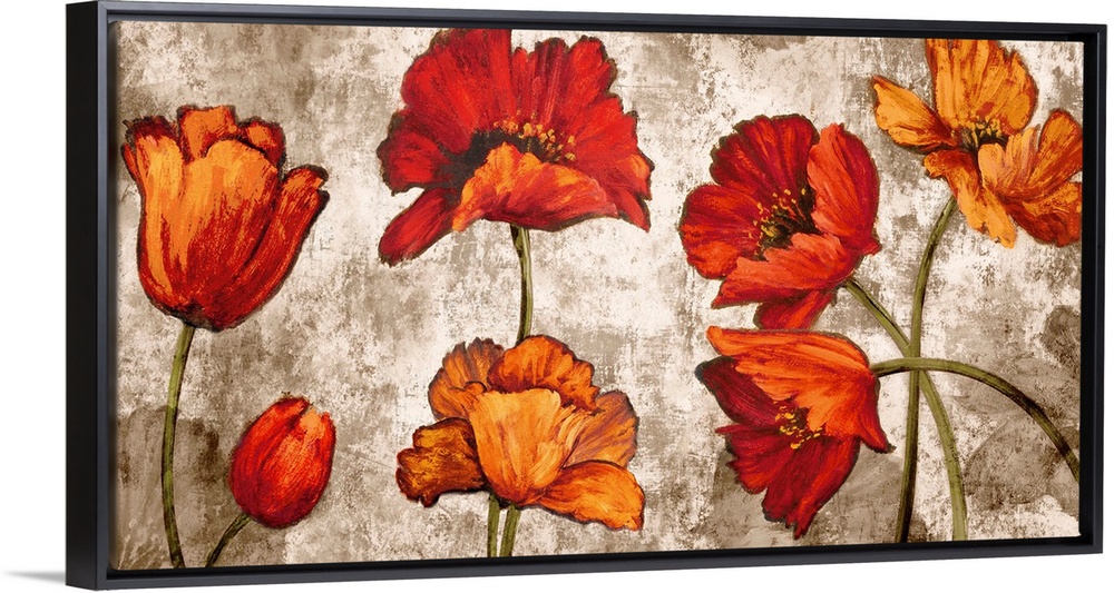 <p>Wide painting of orange and red poppy flowers on a distressed white and brown background.</p>