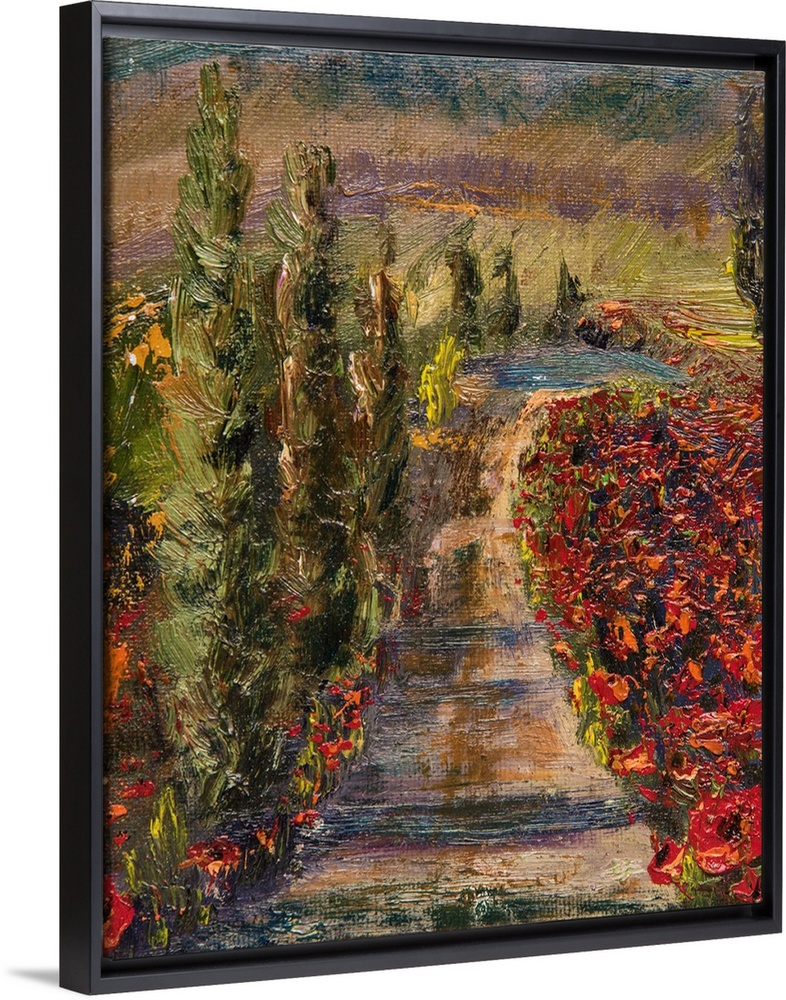 <p>Painting of an abstract landscape with a dirt road lined with red poppies.</p>