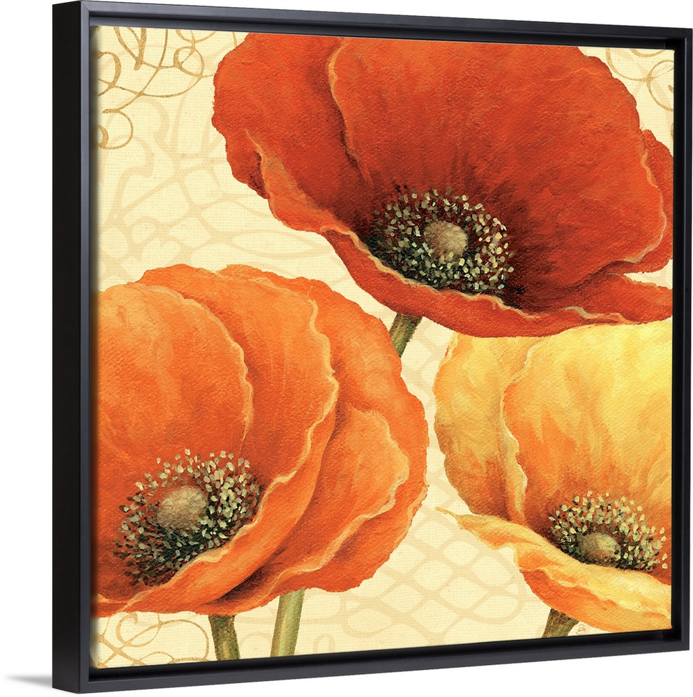<p>Up-close painting of three flower blossoms with a scroll-like patterned background.</p>
