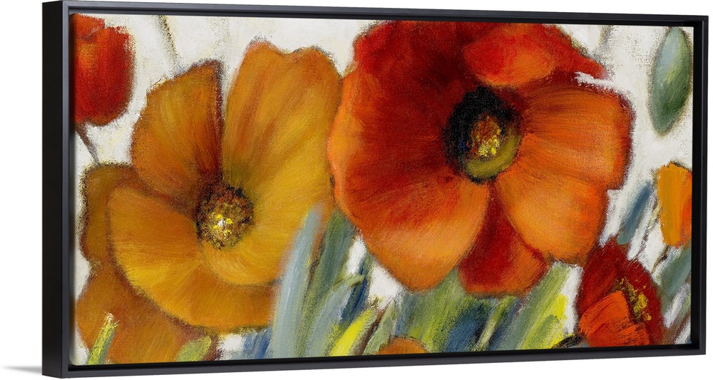 <p>Oversized, horizontal floral painting of two large poppies in warm tones, with several smaller poppies and grasses surrounding them.</p>