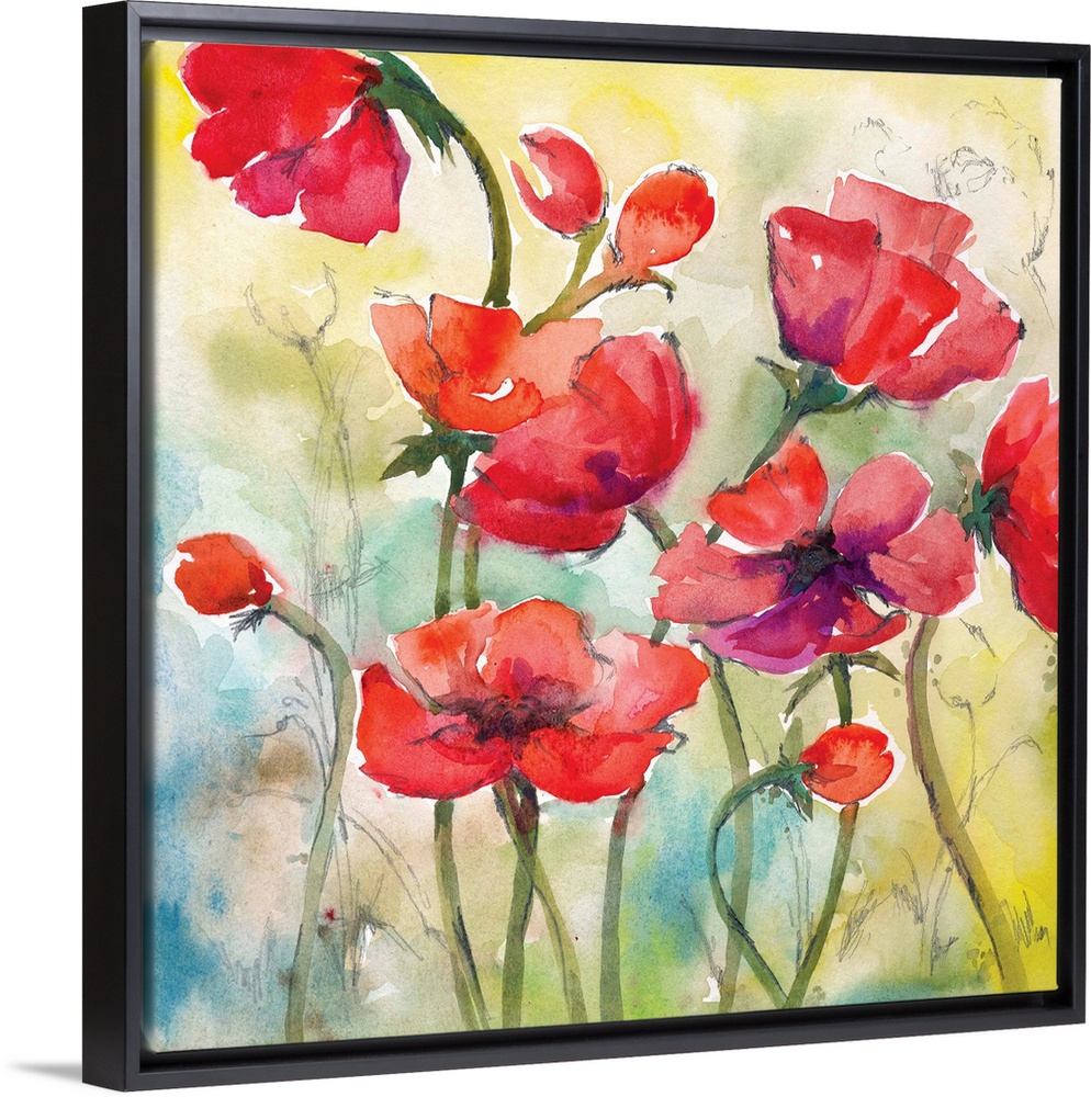 <p>Square watercolor painting of red poppies with hints of purple on a blue, green, and yellow background with light sketches.</p>