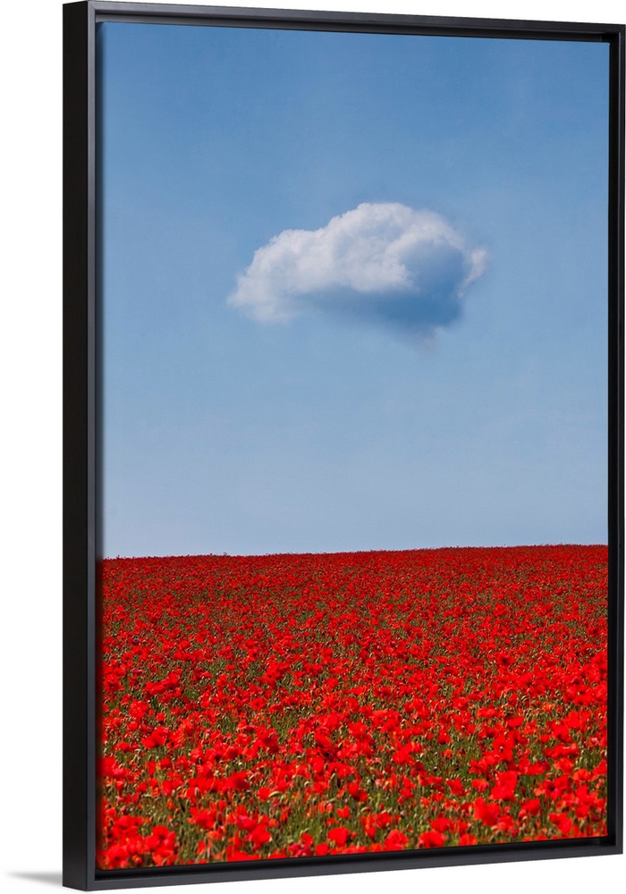 <p>A lone white fluffy cloud above a sea of deep crimson red poppies in a field beneath a blue sky.</p>