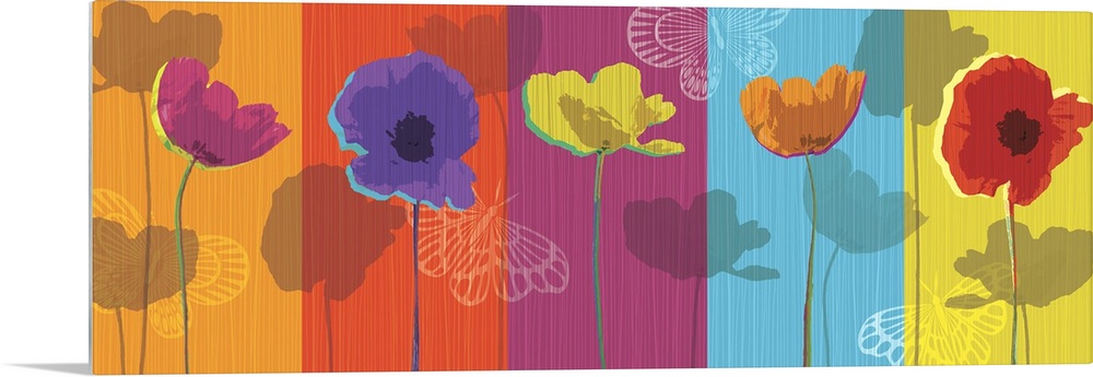 <p>A long horizontal design of different colored poppies with white butterflies against bright colored panels.</p>