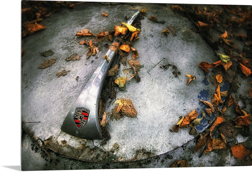 <p>Fallen leaves on the hood of an abandoned Porsche.</p>