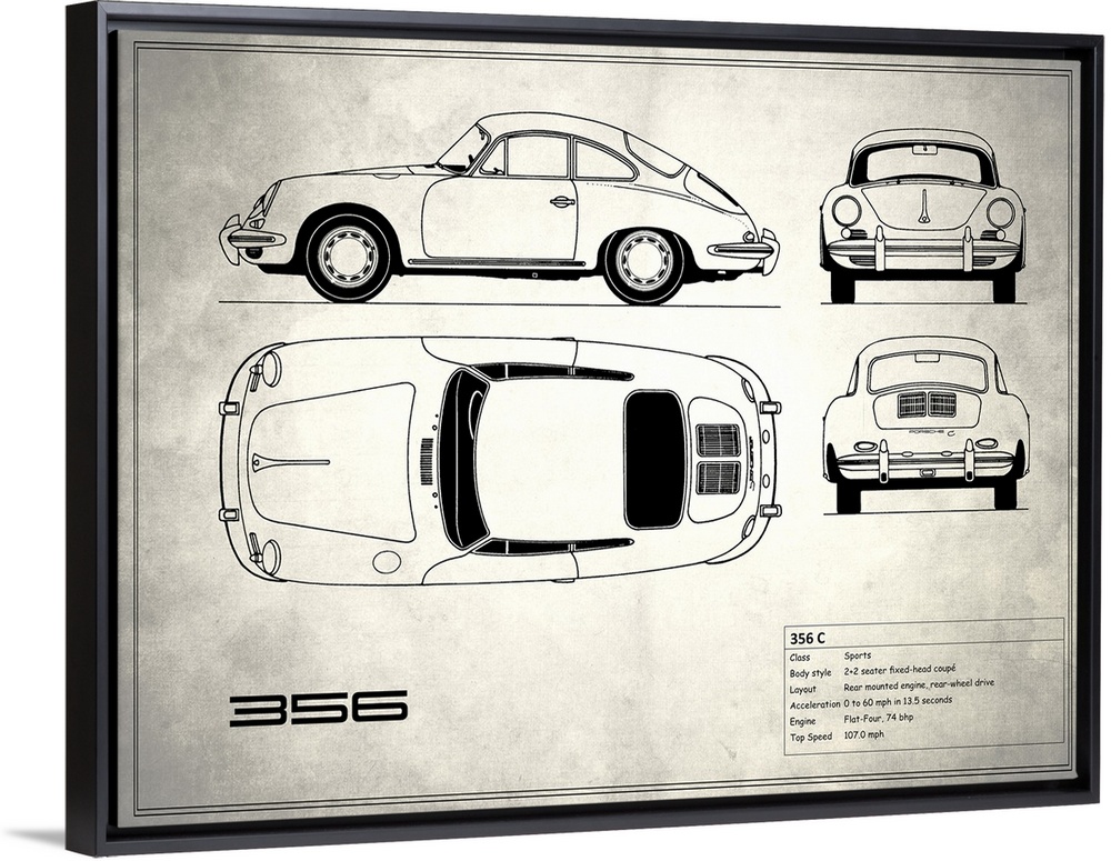 <p>Antique style blueprint diagram of a Porsche 356C printed on a weathered white and gray background.</p>