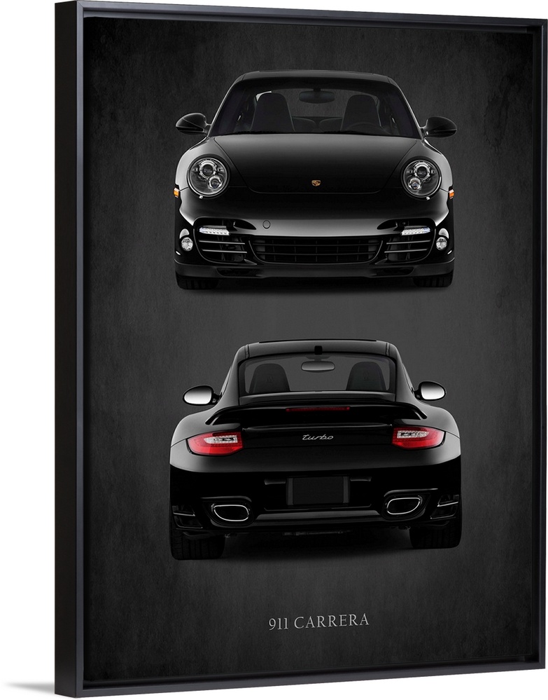 <p>Photograph of the front and back view of a black Porsche 911 Carrera Turbo printed on a black background with a dark vignette.</p>