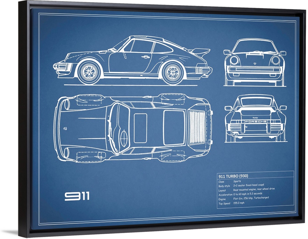 <p>Antique style blueprint diagram of a Porsche 911 Turbo 1977 printed on a blue background</p>