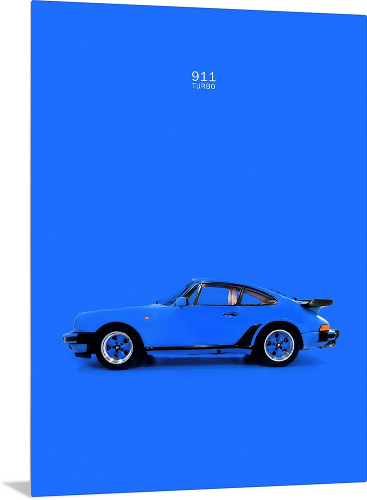 <p>Photograph of a blue Porsche 911 Turbo printed on a blue background</p>