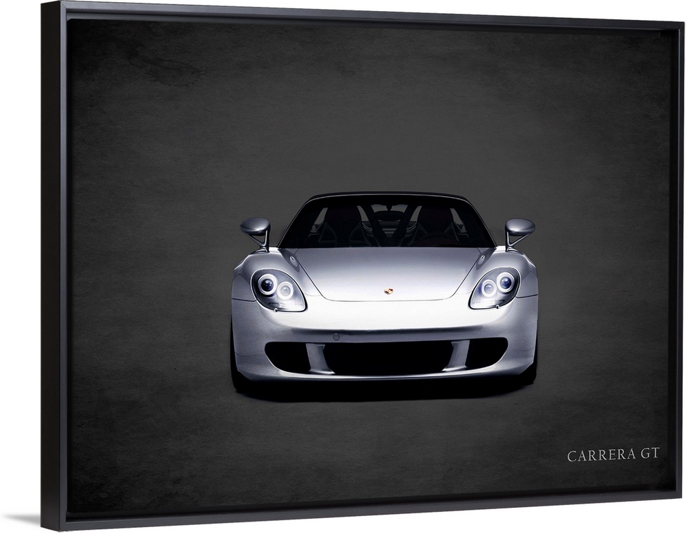 <p>Photograph of a silver Porsche Carrera GT printed on a black background with a dark vignette.</p>