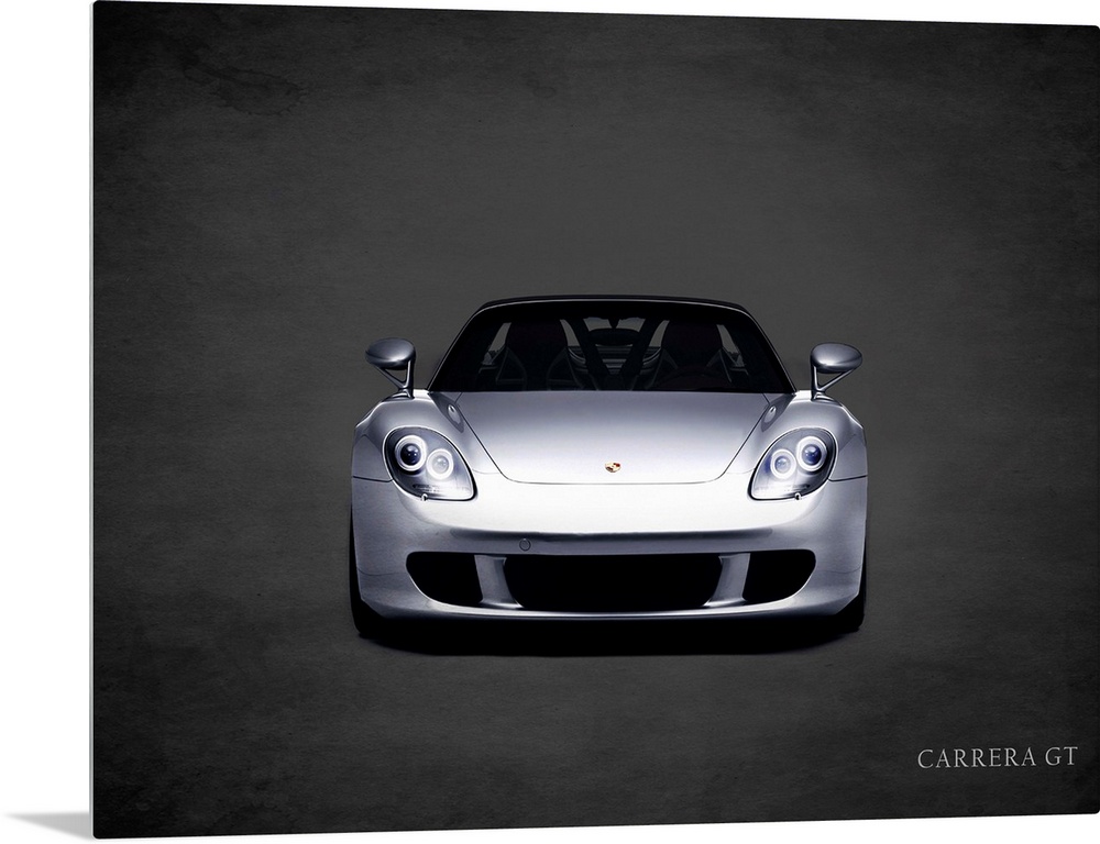 <p>Photograph of a silver Porsche Carrera GT printed on a black background with a dark vignette.</p>