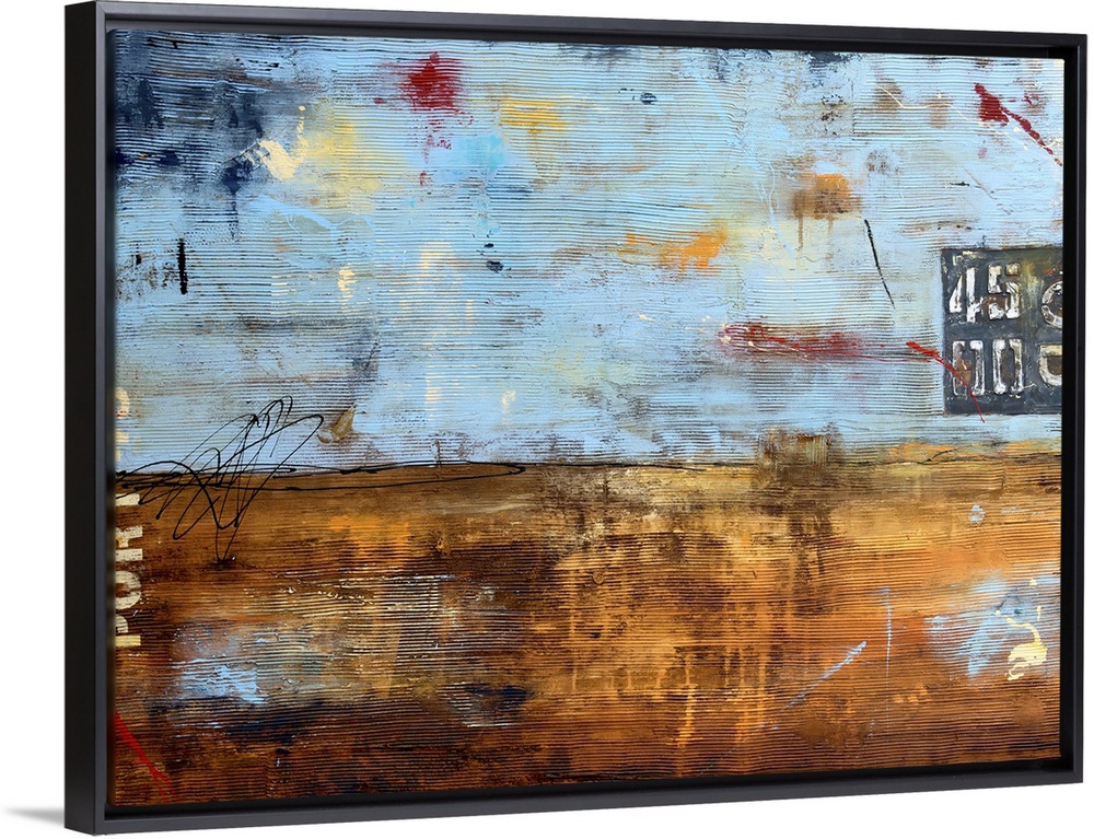 <p>A textured contemporary abstract painting with sky blue tones and different shades of brown and orange alongside varied hints of red, yellow, navy, and tan. Text and numbers can be found on both the left and right side of the painting, while deep lines run horizontally across the entirety of it.</p>