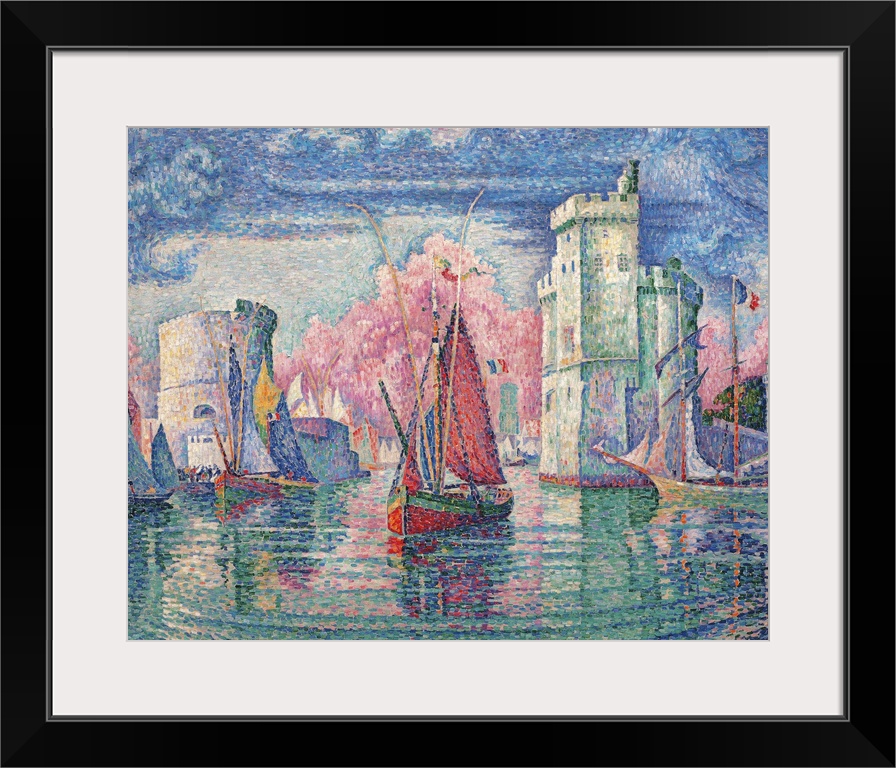 <p>Port of La Rochelle, by Paul Signac, 1921, 20th Century, oil on canvas, cm 130 x 162 - France, Ile de France, Paris, Muse dOrsay, RF1982-59. All. Port of La Rochelle sea azure light blue grey shore water waves tower clouds pink boar sail banner. (246318)</p>