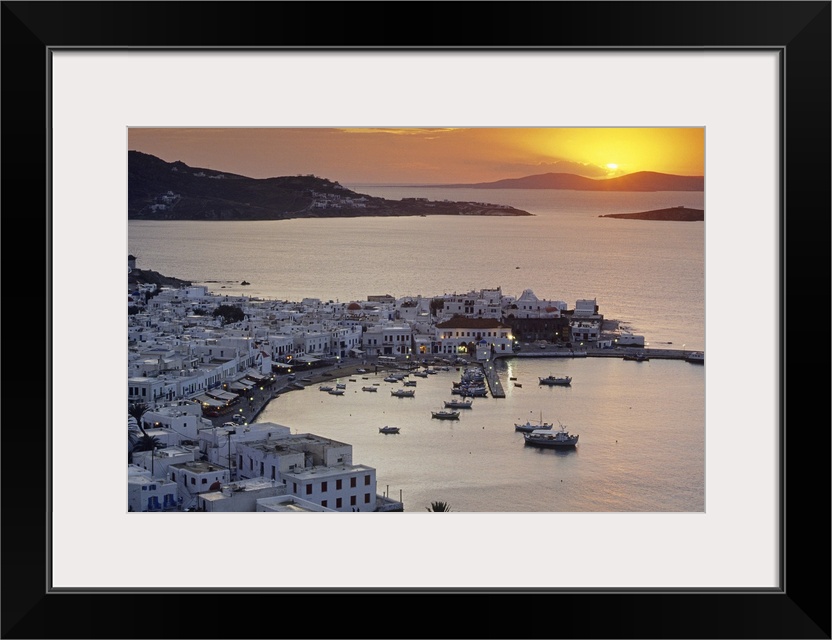 <p>Port of the island of Mykonos, one of the Cyclades islands in the Aegean sea at sunset.</p>