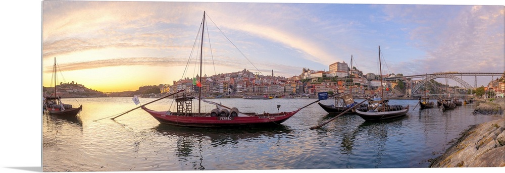 <p>Port wine boats moored on the south bank of Douro River, Porto, Portugal</p>
