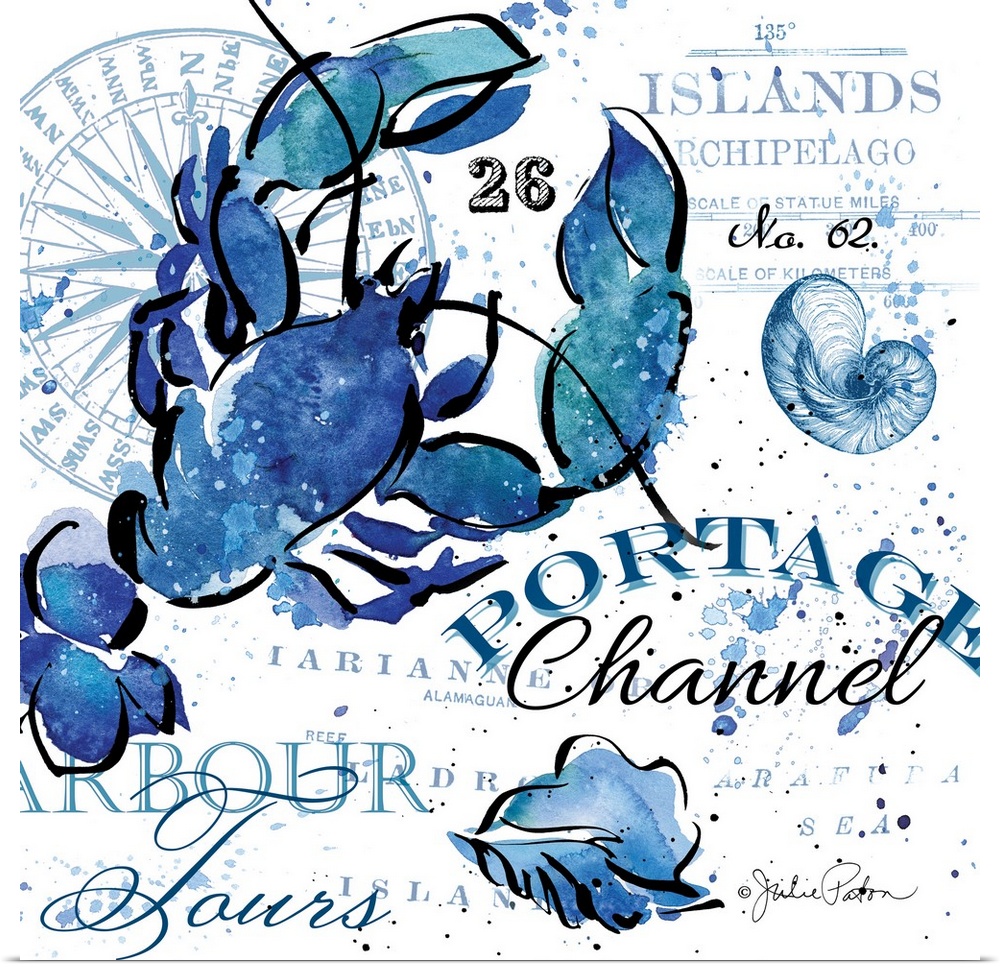 <p>Square beach themed art in shades of blue on a white background.</p>