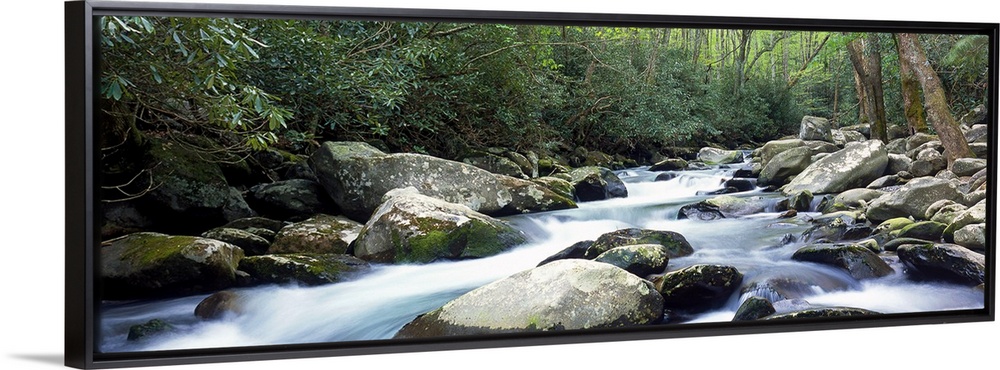 <p>Wide angle photograph of rocky Porter creek rushing through a dense forest of greenery and trees in Smoky Mountains National Park, Tennessee.</p>